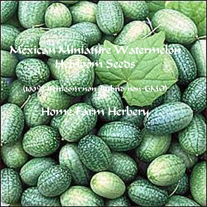 At Home Farm Herbery we have a newly rediscovered heirloom seed called the Mexican Miniature Watermelon which produces abundant crops of 1-2" fruits that have the appearance of miniature watermelons. However, it is a fruit that is a gherkin that tastes like a sour gherkin pickle without doing the pickling.