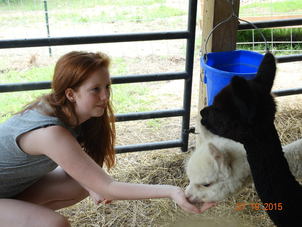 Granddaughter feeding alpacas