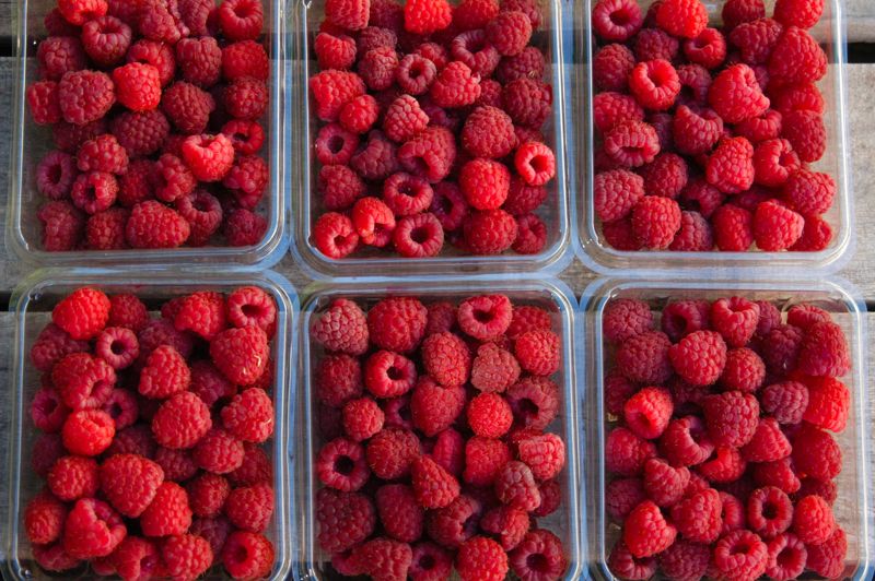 Half flats of raspberries from Tahoma Farms.