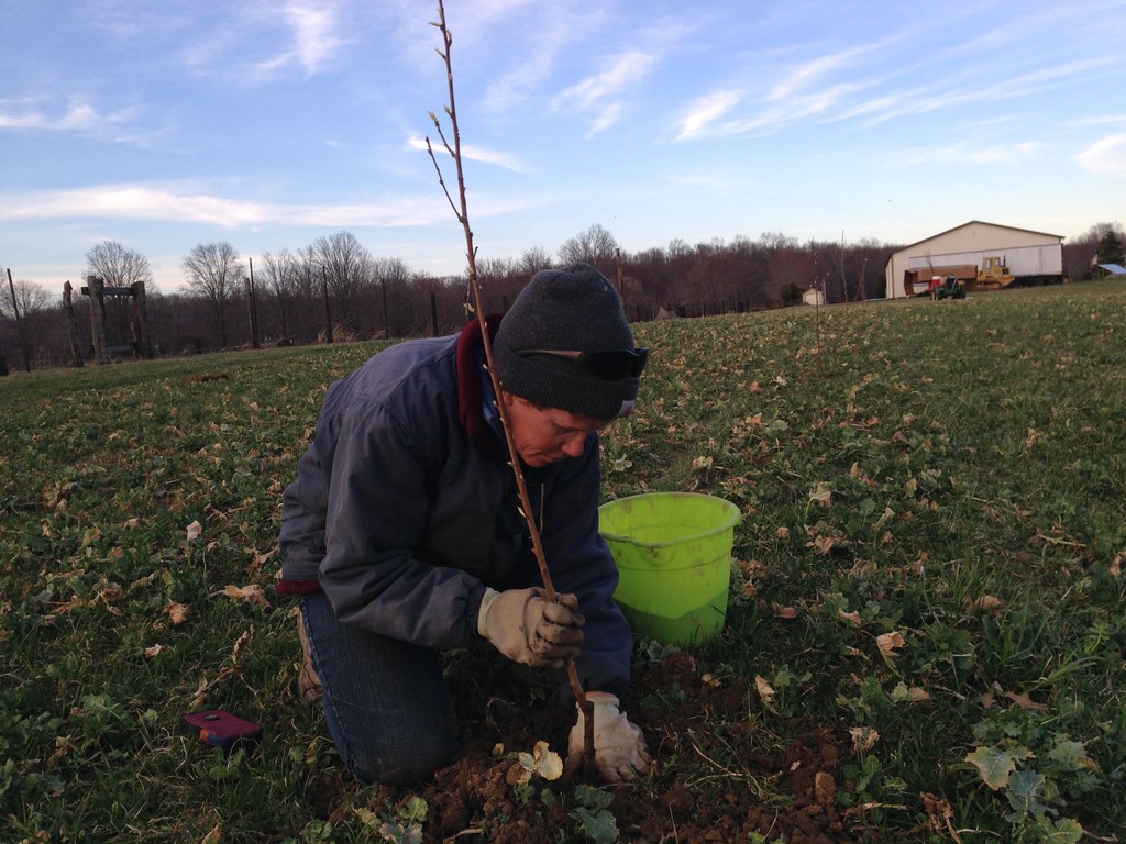 Amy planting peach trees.