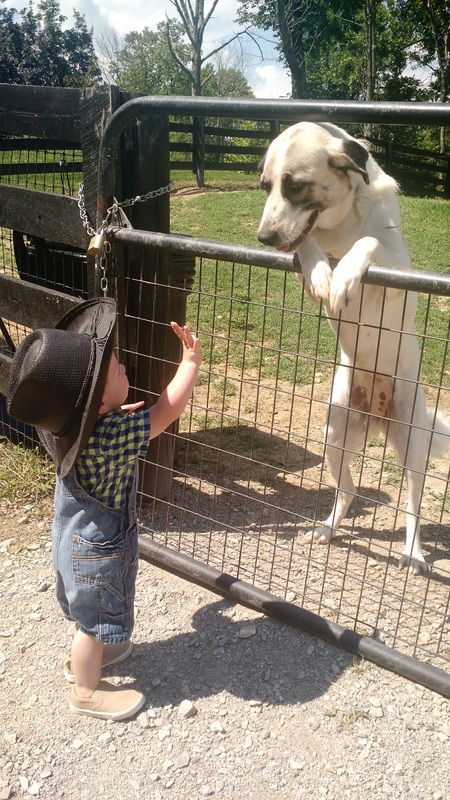 Grandson greeting our guardian dog, Molly