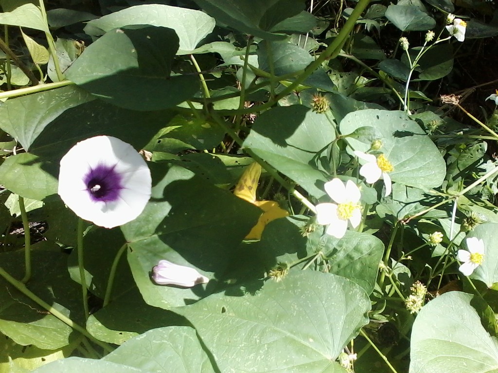 Sweet potato in bloom and some Shepherds Needle edible 'weeds'