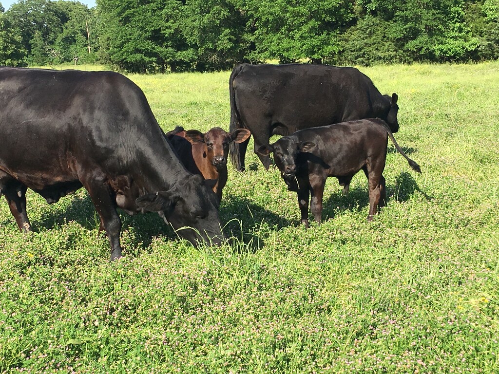 Cows grazing on grass and clover